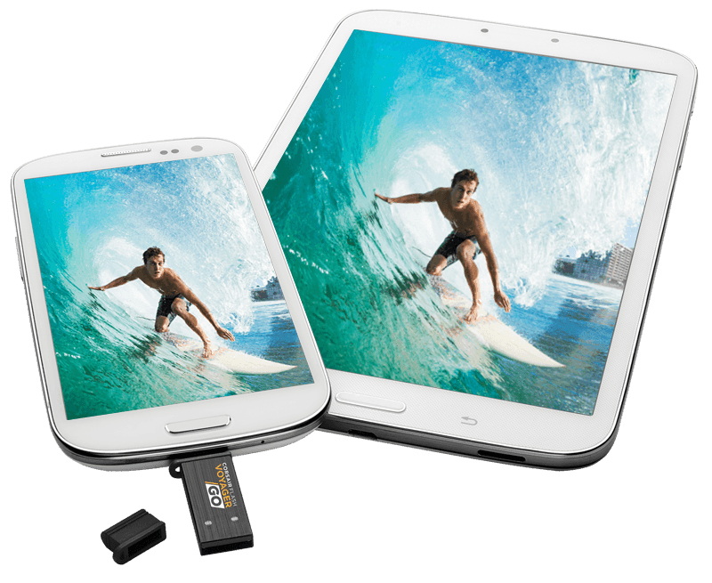 Flash Voyager GO dispone de un conector USB 3.0 para el PC o Mac y de un conector micro-USB para el teléfono o tableta Android. Requiere un dispositivo Android de última generación compatible con USB On-The-Go (conocido también como USB OTG).