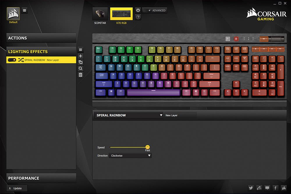 Cada tecla del teclado K70 RGB puede tener asignado su propio color de fondo y su propia intensidad para una personalización prácticamente ilimitada. Cuando la acción está en su momento álgido, los microsegundos cuentan y los atajos de teclas multicolores pueden darle el control del juego de forma nunca vista. El potente e intuitivo software Corsair Utility Engine (CUE) permite configurar de manera fácil sofisticadas macros animadas y efectos de iluminación para una experiencia visualmente sorprendente.
