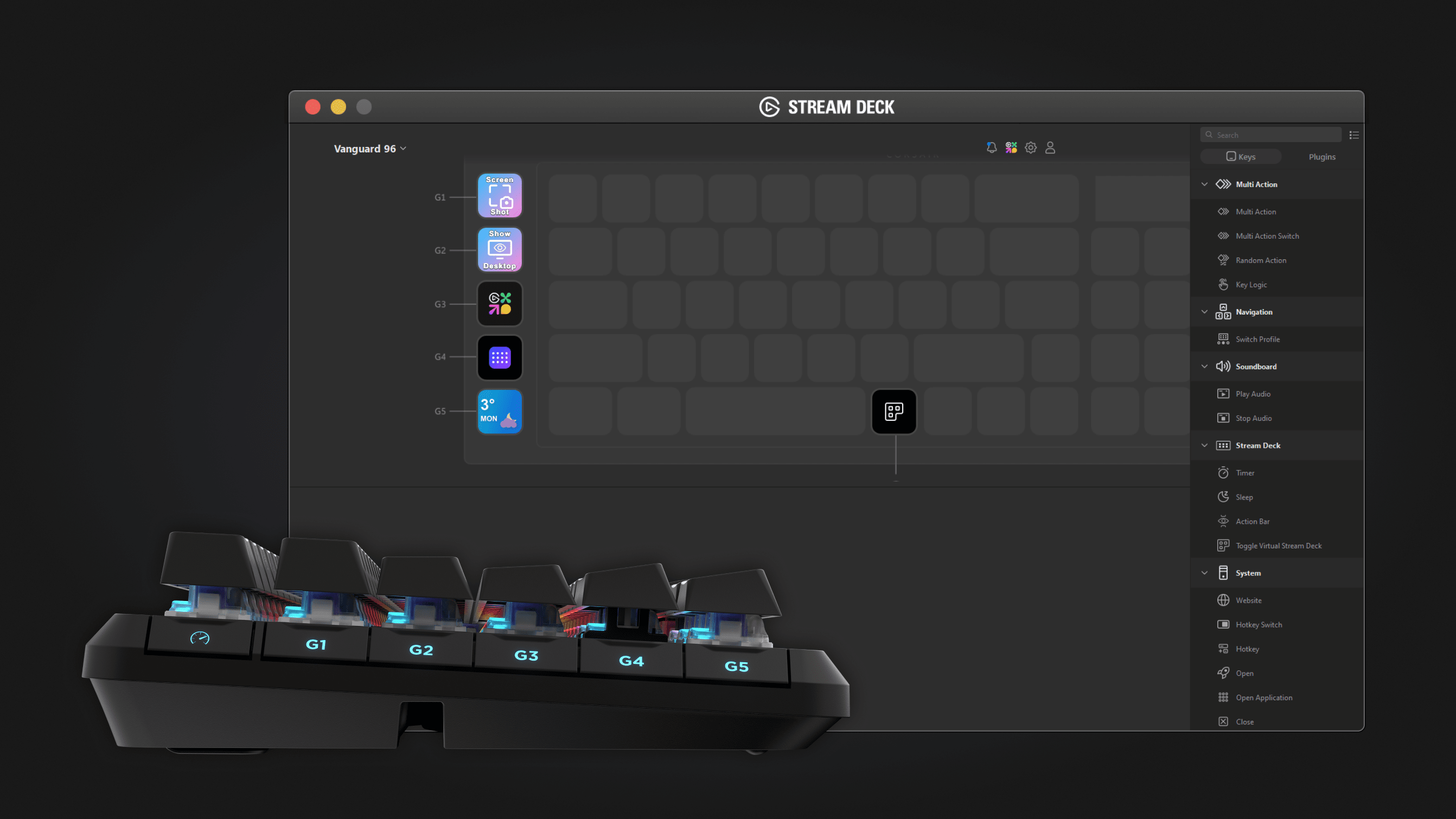 Use Elgato Virtual Stream Deck integration to create clickable shortcuts that can be freely positioned on-screen or accessed via hotkey. Hit the dedicated Virtual Stream Deck Launch Button to instantly summon a Virtual Stream Deck. Give your VANGUARD 96 powerful new versatility, transforming your new favorite gaming keyboard into a powerful productivity tool as well.