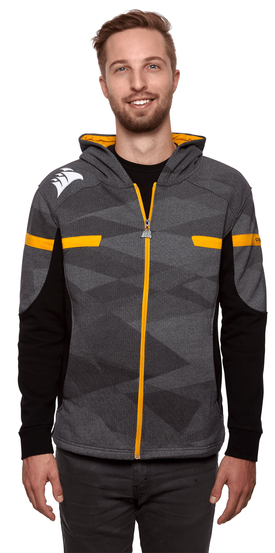 The 60/40 cotton and polyester blended zip-up hoodie is engineered for pure comfort. The CORSAIR Sails zipper delivers a tactile and mechanical feel, making the CORSAIR zip-up hoodie the most durable and comfortable solution for every tournament, convention, or LAN party.
