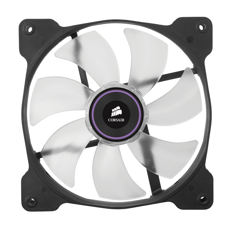 Corsair Air Series LED high static pressure PC case fans combine efficient high pressure airflow with striking LED lighting. They’re custom designed to deliver air directly to high-temperature components with less noise and turbulence than ordinary fans. The custom-molded blades are translucent and have a frosted texture, so the light from the four LEDs adds a dramatic effect.